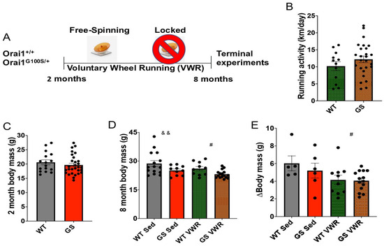 Humans harboring the ORAIG98S/+ mutation typically experience a slowly progressive myopathy with onset of symptoms commonly reported in childhood [26,43]. Zhao et al. showed that myotubes and FDB fibers from young (≤five weeks old) Orai1G100S/+ (GS) mice exhibit increased constitutive Ca2+ entry in the absence of TAs, whereas FDB fibers from eight-month-old adult GS mice display TAs but lack both constitutive and store-operated Ca2+ entry [50]. Since sustained VWR (from 9–24 months of age) restored SOCE and reduced the development of TAs in aged WT male mice [53], we singly housed WT and GS mice in cages with either free-spinning (VWR) or locked (sedentary control) wheels from two to eight months of age (Figure 1A). While myalgia and exercise-induced cramps are associated with the presence of TAs [73,74,75,76], average daily running activity was not significantly different between eight-month-old WT and GS mice (Figure 1B). At two months of age prior to VWR, no difference in body mass was observed between WT and GS mice (Figure 1C). However, at eight months of age, GS mouse body mass was significantly lower than age-matched WT mice both with and without VWR (Figure 1D). Furthermore, VWR from two to eight months of age significantly reduced body mass gain irrespective of genotype (Figure 1E).