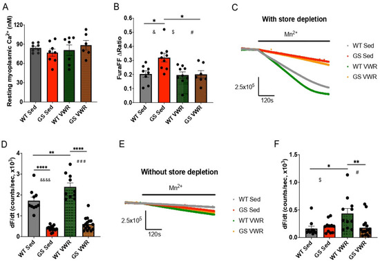 Ca2+ measurements from isolated FDB fibers. (A) Resting myoplasmic Ca2+ measurements of fibers from WT and GS, Sed and VWR mice. (B) Total releasable Ca2+ store content measurements in fibers from WT and GS, Sed and VWR mice. (C) Representative traces from Mn2+ quench assay with SR Ca2+ store depletion to assess SOCE in fibers from WT and GS, Sed and VWR mice. (D) Quantification of SOCE via rate of Mn2+ quench with SR Ca2+ store depletion from (C). (E) Mn2+ quench assay without SR Ca2+ store depletion to assess constitutive Ca2+ entry in WT and GS, Sed and VWR mice. (F) Quantification of constitutive Ca2+ entry via rate of Mn2+ quench without SR Ca2+ store depletion from (E). Each dot is representative of the mean from one mouse. Two-way ANOVA with multiple comparisons */$/#/& p < 0.05, ** p < 0.01, ### p < 0.001, ****/&&&& p < 0.0001. Isolated &, #, $ denote ANOVA group effects of genotype, exercise, and significant interaction of exercise and genotype, respectively. Data displayed as mean +/− S.E.M.