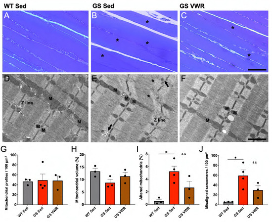 Assessment of mitochondrial structure and sarcomere alignment. (A–C) Histological and (D–F) EM images of longitudinal sections of soleus muscle from WT Sed (A,D), GS Sed (B,E), and GS VWR (C,F) mice. Asterisks in (B,C) point to fibers with non-regular pale-dark striations. In (E), asterisks indicate sarcomeres with Z line streaming and misaligned myofibrils; black arrows point to areas with partial disruption of the regular arrangement of the I band within a sarcomere. M indicates mitochondrial profiles. (G) Quantitative EM analysis of frequency of mitochondrial profiles per 100 µm2. (H) Quantitative EM analysis of mitochondrial volume as a percent of total myofiber volume analyzed. (I) Percentage of mitochondria profiles displaying altered structure. (J) Number of misaligned sarcomeres per 100 µm2. Each dot represents a single mouse. (A–C), scale bar = 200 µm; (D–F), scale bar = 1 µm Two-way ANOVA with multiple comparisons. * p < 0.05, && p < 0.01. Isolated & denotes ANOVA group effect of genotype. Data displayed as mean +/− S.E.M.