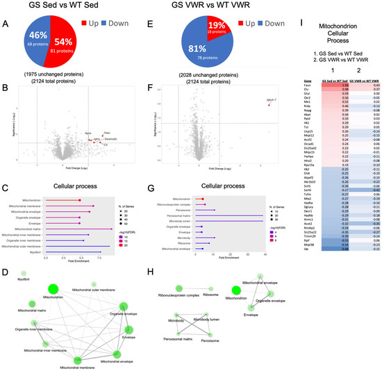 Soleus proteomic analysis of WT and GS, Sed (left) and VWR (right) mice. (A,E) Analysis of significantly up (red) and downregulated (blue) proteins as compared to WT samples. (B,F) Volcano plot analysis of significantly altered proteins. (C,G) Top ten altered GO Cellular process pathway analysis from identified significantly altered proteins with (D,H) network analysis of top ten pathways. (I) Mitochondrion pathway heatmap of the 20 most significantly up- and down-regulated proteins within the pathway when comparing GS Sed vs. WT Sed (column 1) and GS VWR vs. WT VWR (column 2). The complete pathway of all significantly altered proteins is shown in Supplemental Figure S7. For network analyses, connected nodes display 20% or more overlap of proteins between sets, thicker connections display increased overlap; darker nodes depict more significantly enriched protein sets; larger nodes depict larger protein sets. Only significantly altered proteins with p < 0.05 and a Log2 fold change > 1 were identified in the volcano plots. Only significantly altered proteins with p < 0.05 were included in pathway analysis. n = 3 for each cohort.