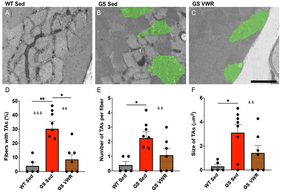 Assessment and quantification of EDL muscle TA prevalence and size. Transverse EDL muscle EM images from (A) WT Sed, (B) GS Sed, and (C) GS VWR mice. Green overlays denote TAs. Quantitative EM analysis of (D) percentage of fibers with TAs, (E) average number of TAs per fiber, and (F) average size of TAs. (A) Scale bar = 1.5 µm. (B,C) Scale bar = 2 µm. Each dot is representative of one mouse. Two-way ANOVA with multiple comparisons. * p < 0.05, **/##/&& p < 0.01, &&& p < 0.001. Isolated &, # denote ANOVA group effects of genotype and exercise, respectively. Data displayed as mean +/− S.E.M.