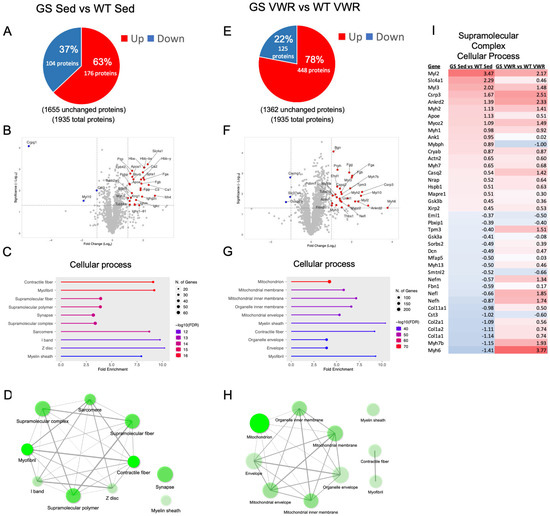EDL proteomic analysis of WT and GS, Sed (left) and VWR (right) mice. (A,E) Analysis of significantly up (red) and downregulated (blue) proteins as compared to WT samples. (B,F) Volcano plot analysis of significantly altered proteins. (C,G) Top ten altered GO Cellular process pathway analysis from identified significantly altered proteins with (D,H) network analysis of top ten pathways. (I) Supramolecular complex pathway heatmap of the most significantly up- and down-regulated proteins within the pathway when comparing GS Sed vs. WT Sed (column 1) and GS VWR vs. WT VWR (column 2). The complete pathway of all significantly altered proteins is shown in Supplemental Figure S11. For network analyses, connected nodes display 20% or more overlap of proteins between sets, thicker connections display increased overlap; darker nodes depict more significantly enriched protein sets; larger nodes depict larger protein sets. Only significantly altered proteins with p < 0.05 and a Log2 fold change > 1 were identified in the volcano plots. Only significantly altered proteins with p < 0.05 were included in pathway analysis. n = 3 for each cohort.