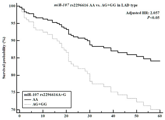Survival analysis of the miR-107 rs2296616 dominant model (AA vs. AG + GG) in LAD type of ischemic stroke patients. The miR-107 rs2296616 AG + GG genotype has confirmed the increasing hazard ratio of ischemic stroke patients (adjusted HR: 2.057, 95% CI: 1.029–4.112, p < 0.05).
