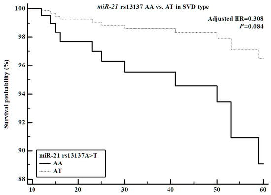 Survival analysis of the miR-21 rs13137 AT genotype in SVD-type ischemic stroke patients. The miR-21 rs13137 AT genotype has confirmed the decreasing hazard ratio of ischemic stroke patients (adjusted HR: 0.308, 95% CI: 0.081–1.165, p = 0.084), but it did not show a significant p-value.
