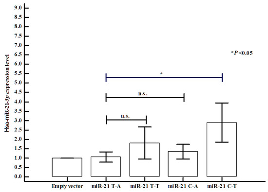 pcDNATM3.1(−) vector was purchased from Thermo Fisher Scientific (Thermo Fisher Scientific, Waltham, MA, USA). The miR-21 expression vector contained the Precursor-miR-21 sequence, including miR-21 rs1292037 T > C and rs13137 A > T in pcDNATM3.1(−). The four miR-21 expression vectors had haplotypes of miR-21 rs1292037 T > C and rs13137 A > T polymorphisms as T-A, T-T, C-A, and C-T, respectively. The vector and inserts were ligated at 16 °C for 16 h at a molar ratio of 1:3 using T4 DNA ligase. After the ligation process, this mixture was combined with E. coli competent cells DH-5α strain to construct the expression vector. These processes were performed: 10 µL of ligation mixture and 100 uL of competent cells mixed and incubated on ice for 30 min, followed by heat shock at 42 °C for 90 s and incubation on ice for 3 min. We have incubated for 60 min at 37 °C to restore the cells without shaking in 700 µL of Luria–Bertani (LB) broth (BD, Becton, Dickinson and Company, Sparks, MD, USA). Then, the suspended E. coli cells in 200 uL of LB broth were spread on the LB-agar plate containing 100 µg/mL of ampicillin and incubated at 37 °C overnight to select the transformants. After overnight incubation, one colony of the plate was transferred to 5 mL of LB broth supplemented with ampicillin (50 µg/mL) for 6 h of pre-incubation at 37 °C before transfer to 200 mL LB broth for a further overnight incubation in the shaking incubator. Furthermore, the E. coli was harvested using a centrifuge at 4000 rpm for 10 min, and used as a pellet to extract plasmid DNA using QIAGEN® plasmid midi (Qiagen, Germantown, MD, USA) and AccuPrep® Plasmid Mini Extraction Kit (Bioneer, Daejeon, Republic of Korea).