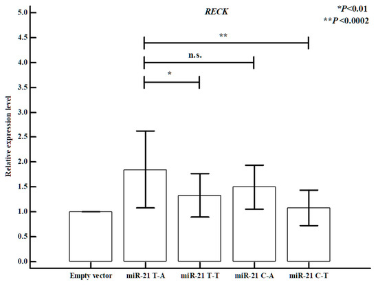 Finally, we investigated potential target genes and reviewed reference studies related to miR-21 binding. Through transfection experiments using a miR-21 expression vector in EA.hy926 cells, we found that miR-21 mRNA expression levels differed according to haplotypes formed by miR-21 rs1292037 and rs13137 polymorphisms (Figure 3). Analysis of miR-21 expression levels demonstrated that the T-A haplotype (rs1292037-rs13137) resulted in significantly lower expression compared with the C-T haplotype. Moreover, expression levels of predicted target genes, such as RECK, significantly differed according to miR-21 rs1292037-rs13137 haplotype (Figure 4).