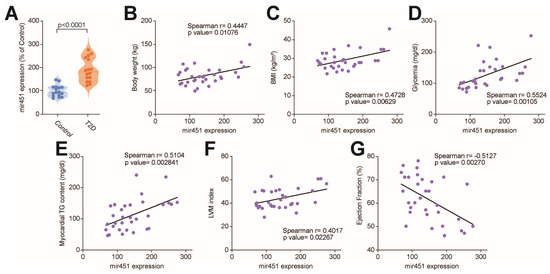Upregulation of miR-451 in myocardial specimens from patients with type 2 diabetes. (A) Real-time PCR shows expression of miR-451 in right atrial specimens from T2D patients compared to subjects without diabetes. Results are presented as mean ± SD and were compared using Student’s t test. p-value < 0.05 was considered significant. Adjusted p-values (alpha/g) are shown. (B–G) Correlation of miR-451 expression with body weight, body mass index, fasting glucose, myocardial triglyceride content, left ventricular mass and ejection fraction. r indicates Spearman correlation coefficient. BMI, body mass index; EF, ejection fraction; LV mass, left ventricular mass; TG, triglyceride.