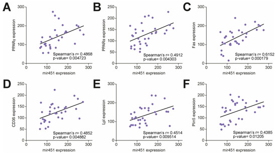 Association of cardiac miR-451 with lipid-related transcriptional programs. (A–F) Correlation of miR-451 expression with lipid-related transcripts, including PPARγ-, PPARα- and PPAR-dependent genes Fas, Cd36, Lpl and Plin5. r indicates Spearman correlation coefficient. Fas, fatty acid synthase; Lpl, lipoprotein lipase; Plin5, perilipin 5.
