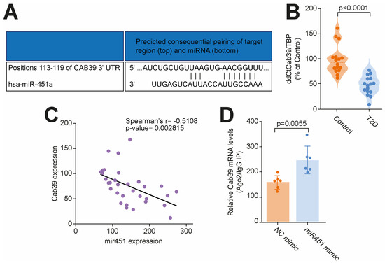 Calcium-binding protein 39 (Cab39), a scaffold protein of liver kinase B1 (LKB1) involved in the regulation of AMP-activated protein kinase (AMPK) signaling [18], was reported to be a direct target of miR-451 in a mouse model of T2D. In silico analysis confirmed Cab39 to be a direct target of miR-451 in humans (Figure 3A). We next validated the Cab39 expression in our setting and found a significant downregulation of Cab39 in myocardial specimens from the T2D patients vs. the controls without diabetes (Figure 3B). Moreover, we observed a strong negative correlation between the miR-451 levels and Cab39 expression, suggesting a possibility of miR-451-induced Cab39 repression also occurring in humans (Figure 3C). RISC(ago2) immunoprecipitation was employed to demonstrate whether miR-451 affected the interaction of Cab39 mRNA with Argonaute 2 (Ago2), a major component of the RISC complex. The association of Cab39 mRNA with Ago2 was assayed using a real-time PCR of Cab39 mRNA in Ago2 immunoprecipitates (IP). We found that Cab39 mRNA in Ago2 IP samples was enriched by miR-451, thus validating that miR-451 facilitates an endogenous association between Cab39 mRNA and RISC (Figure 3D).