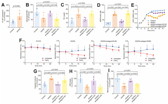 Targeting miR-451 rescues diabetes-induced lipotoxic injury in human cardiomyocytes. (A) miR-451 expression in CMs exposed to high glucose concentration and palmitic acid vs. normal glucose concentration (control group). (B) Cab39 gene expression in CMs exposed to control conditions or combination of high glucose concentration and palmitic acid, in presence or absence of miR-451 inhibition by specific antagomiR. (C) Triglyceride content across 4 experimental groups. (D) Lipid peroxidation assessed based on malondialdehyde (MDA) levels in CMs exposed to high glucose concentration and palmitic acid, in presence or absence of miR-451 inhibition. (E) miR-451 restores mitochondrial biogenesis in CMs treated with high glucose concentration and palmitic acid. Changes in SDHA and COX-1 levels (MitoBiogenesis assay) were normalized to total cell number. (F) Mitochondrial swelling assay. Line graphs represent time-course of decrease in light absorbance with (blue line) and without (red line) calcium overload. * Different from untreated cells at p < 0.05. (G) CM apoptosis assessed using Caspase-3 assay across 4 experimental groups. (H,I) Inhibition of miR-451 exerts favorable metabolic effects by restoring fatty acid oxidation and ATP production. Results are presented as mean ± SD and compared using ANOVA followed by Bonferroni post hoc test. p-value < 0.05 was considered significant. Adjusted p-values (alpha/g) are shown.