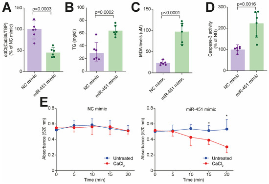 miR-451 mimic recapitulates features of lipotoxic injury in human cardiomyocytes. (A) Cab39 gene expression in CMs treated with mir-451 mimic or NC mimic. (B) Triglyceride content across 2 experimental groups. (C) Lipid peroxidation assessed based on malondialdehyde (MDA) levels in CMs in presence or absence of miR-451 mimic. (D) CM apoptosis assessed using Caspase-3 assay across 2 experimental groups. (E) Mitochondrial swelling assay. Line graphs represent time-course of decrease in light absorbance with (blue line) and without (red line) calcium overload. * Different from untreated cells at p < 0.05. Results are presented as mean ± SD and were compared using Student’s t test. p-value < 0.05 was considered significant. Adjusted p-values (alpha/g) are shown.