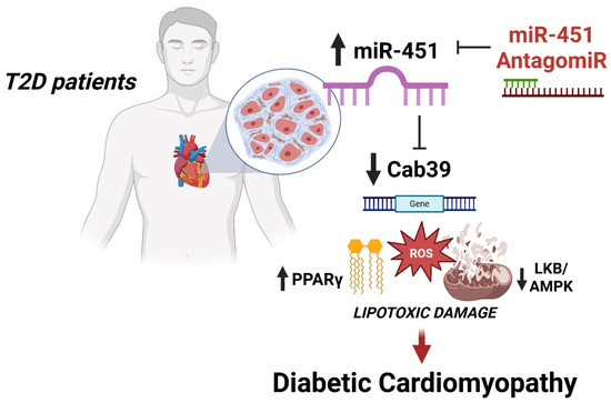 Schematic summarizing the study’s findings. In the human diabetic myocardium, upregulation of miR-451 decreases the levels of the AMPK-activating gene Cab39, thus fostering lipid accumulation, oxidative stress, mitochondrial dysfunction and apoptosis. These events contribute to the development of the diabetic cardiomyopathy phenotype. Targeting miR-451 prevents features of diabetes-related lipotoxic injury.