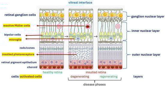 Although ideal and described in animal models, the major steps occurring at the insulted retinal level and the cells involved in these microenvironmental changes and tissue-function recovery are schematized in Figure 1.