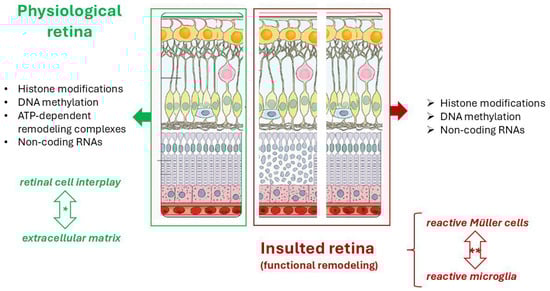 Schematic representation of the epigenetic factors participating in physiological homeostasis cell-to-cell and cell-to-matrix interplay and retinal regeneration upon insult in adult zebrafish. DNA methylation, Histone modifications and ATP-dependent remodeling complexes are mechanisms of chromatin remodeling. The asterisk (*) indicates a homeostatic crosstalk between retinal cells and extracellular matrix while (**) point at the crosstalk between reactive Müller cells and activated Microglia in the attempt to restore a physiological retina upon insult, by providing neuroprotection and promoting repair to restore physiological conditions. This image was created with BioRender (https://biorender.com/, accessed on 4 September 2025).