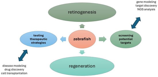 Overview of present and potential zebrafish applications in basic, applied, and translational Zebrafish eye research. Retinogenesis and regeneration upon physiological and pathological states represent the major fields of investigation in zebrafish model. The main actions are testing therapeutic strategies and screening the potential targets represent the goals that hopefully can be achieved in a shorter time by using this animal model. NGS, Next-Generation Sequencing. (Microsoft PowerPoint, Office 365; Redmond, WA, USA).