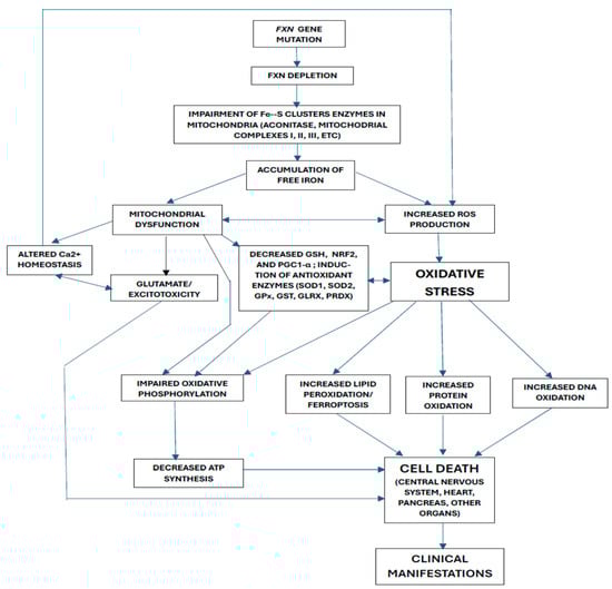The primary histopathological hallmark of FRDA is the degeneration of dorsal root ganglia. This leads to the secondary degeneration of the dorsal spinal roots, posterior spinal cord columns, gracilis and cuneate nuclei, spinocerebellar tracts, dentate nuclei of the cerebellum, corticospinal tracts, and the heart [4,5]. Although the pathogenic mechanism of FRDA is not fully understood, the marked deficiency of FXN and its role in iron metabolism suggest that oxidative stress plays a central role. Oxidative stress refers to an imbalance between the production of reactive oxygen species (ROS) and the body’s antioxidant defenses, leading to the oxidation of lipids, proteins, and DNA.
