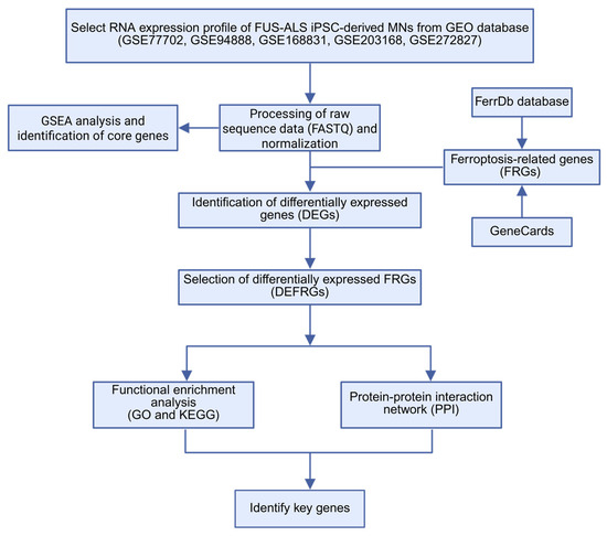 The workflow of this study. ALS, amyotrophic lateral sclerosis; DEG, differentially expressed genes; FRG, ferroptosis-related gene; DEFRGs, differentially expressed ferroptosis-related genes; GO, gene ontology; KEGG, Kyoto Encyclopedia of Genes and Genomes; PPI, protein–protein interaction.