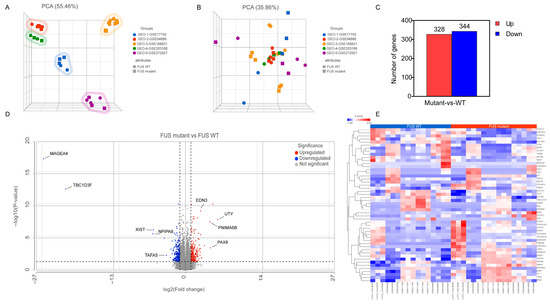Transcriptomic data analysis. (A) Principal component analysis (PCA) of samples before batch effect removal and (B) after batch-effect removal, highlighting similarities and differences in the gene expression between the various FUS samples compared to WT samples. In the three-dimensional PCA plot, each sample is represented as a sphere/square; the closer the spheres/squares in the spreadsheet, the higher the similarity among sample groups. A total of 33 types of samples from 5 different datasets are shown on this figure; different colors indicate different datasets, while different symbols (sphere/square) represent sample attribute types (WT; sphere and FUS mutant; square). (C) Statistics on the results of differentially expressed genes (DEGs) in the FUS samples. (D) Volcano plot displaying the distribution of DEGs between FUS mutant and WT controls (p ≤ 0.05, FDR ≤ 0.05 and log2Fold Change) ≥ 1 or log2(Fold Change) ≤ −1). (E) Heatmap representing the expression profile of the 50 DEGs identified by FUS mutant versus WT controls (p ≤ 0.05, FDR ≤ 0.05, |log2FC | ≥ 1). Expression values sorted according to sample (rows) and gene (columns), where the color change from red to blue suggests gene expression changing from high to low.