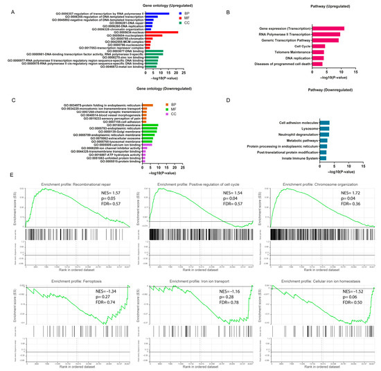 Functional enrichment analysis of DEGs. (A) Bar plot of gene ontology (GO) enrichment analysis of upregulated DEGs. (B) Pathway enrichment analysis of upregulated DEGs. (C) Bar plot of gene ontology (GO) enrichment analysis of downregulated DEGs. (D) Pathway enrichment analysis of downregulated DEGs. GO enrichment analysis was based on the topmost significant enriched terms in each of the biological process (BP), cellular component (CC) and molecular function (MF) entries (p ≤ 0.05). (E) Gene set enrichment analysis (GSEA) was performed using normalized counts from the DESeq2 output ranked list in FUS-ALS datasets (p ≤ 0.05 was considered statistically significant). The top three most significantly enriched gene sets were shown to be positively and negatively correlated with the gene counts based on NES value. The y-axis represents the enrichment score for the overall gene set, and on the x-axis are genes (vertical black bars) represented in gene sets.