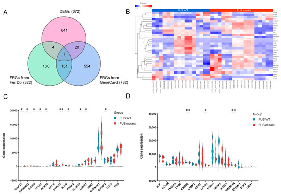 Identification of differentially expressed ferroptosis-related genes (DEFRGs). (A) Venn diagram identifying the 31 overlapping DEFRGs between DEGs in GEO datasets (672) and ferroptosis-related genes (322) in the FerrDB and GeneCard (732) databases, respectively. FRGs, ferroptosis-related genes; DEFRGs, differentially expressed ferroptosis-related genes. (B) Heatmap displaying the expression of 31 DEFRGs in FUS and healthy controls (WT). (C,D) Violin plots illustrating the gene expression levels of 31 DEFRGs between FUS mutant and WT controls. (C) A total of 16 upregulated genes (D) 15 downregulated genes, blue for WT group, and red for FUS mutant group; the X-axis shows the ferroptosis-related genes, and the Y-axis represents the expression level of genes. Student’s t test was employed to assess the gene expression values between the mutant and WT groups. The asterisks indicate that the differences are statistically significant (* p ≤ 0.05, ** p ≤ 0.01).