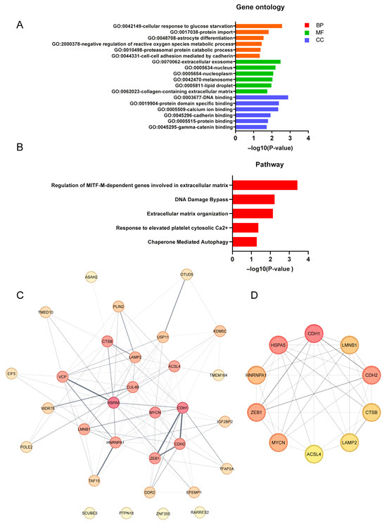 Functional enrichment analysis and PPI analysis of DEFRGs. (A) GO enrichment analysis of DEFRGs based on the top significantly enriched terms in each of the BP, CC and MF groups. (B) Pathway enrichment analysis of DEFRGs based on the top enriched pathways. The X-axis represent p-values, and the Y-axis indicates the GO/pathway terms. (C) Protein–protein interaction (PPI) network of the 31 candidate DEFRGs, in which the nodes represent proteins, and the edges represent the interaction of proteins. A thicker line indicates stronger data evidence, and genes/proteins of a darker color were distinguished using color shading from darker to lighter, according to the score (topological parameters). (D) Top 10 hub DEFRGs identified by the maximal clique centrality (MCC) algorithm using Cytoscape (cytoHubba plugin); the deeper the color, the higher the gene rank. GO, gene ontology; BP, biological process; CC, cellular component; MF, molecular function. For all analyses, p ≤ 0.05 was considered statistically significant.