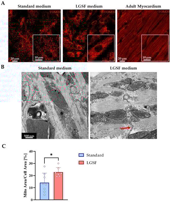 LGSF medium enhances mitochondrial distribution and ultrastructural maturation of the sarcoplasmic reticulum (SR). (A) Confocal images of neonatal cardiomyocytes (CM) cultured for 15 days in standard medium (left) or low-glucose serum-free (LGSF) medium (middle), compared to adult myocardium (right), stained for TOM20 (red) to visualize mitochondria. Insets show higher-magnification views. (B) Transmission electron micrographs under the same condition. Red arrow indicates sarcoplasmic reticulum-like tubular structures in LGSF-cultured cells. (C) Quantification of the mitochondrial area relative to cell size. Data represent pooled measurements from 20 cells per group, collected from n = 8 (Standard) and n = 7 (LGSF) coverslips across three independent cell cultures. Statistical analysis: unpaired two-tailed Student’s t-test; *, p ≤ 0.05.