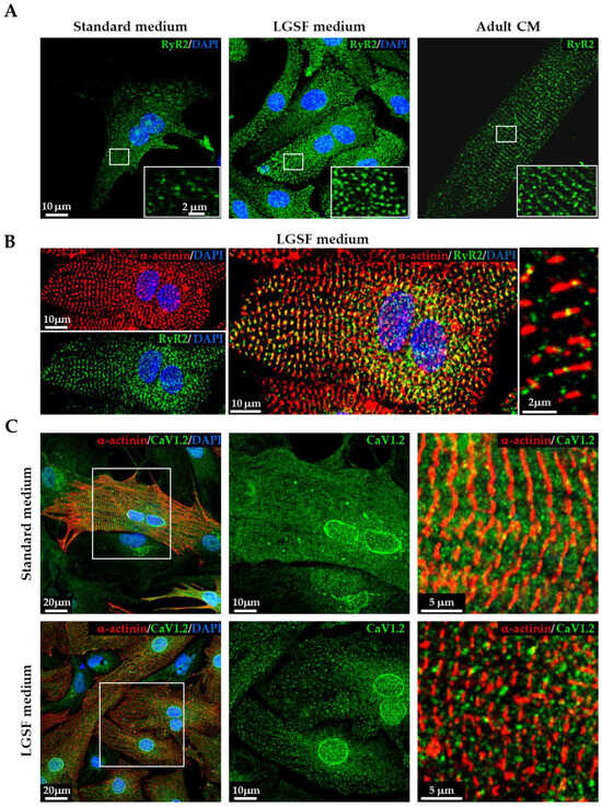One of the most striking effects of the LGSF medium was observed in Ca2+ handling properties, a functional hallmark of CM maturity. In standard cultures, neonatal CMs predominantly depend on extracellular Ca2+ influx via LTCC and the sodium–Ca2+ exchanger (NCX) in reverse mode, due to the underdeveloped SR [,,,,]. Conversely, adult CMs rely on Ca2+-induced Ca2+ release (CICR) from the SR, mediated by tightly coupled dyads formed by LTCC and RyR2 clusters [,,].