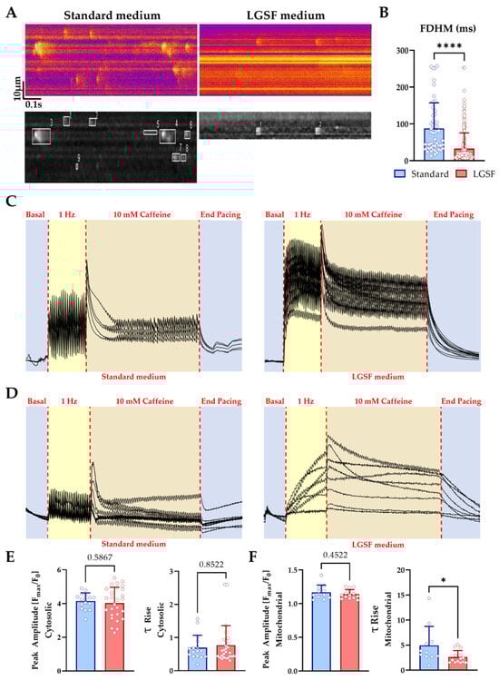 These architectural adaptations of the Ca2+ handling machinery prompted us to ask whether they translated into functional improvements in intracellular Ca2+ dynamics. Spontaneous and evoked Ca2+ signals were analyzed by real-time confocal imaging. In quiescent CM, standard medium produced large, prolonged macro-sparks and frequent Ca2+ waves, consistent with asynchronous and inefficient SR function. In contrast, LGSF-cultured CM exhibited smaller, spatially confined sparks with shorter duration and faster decay (FWHM, standard: 4.2 ± 3.1 vs. LGSF: 2.3 ± 2.0, in µm; FDHM, standard: 87.7 ± 69.8 vs. LGSF: 32.8 ± 42.6., in ms; p < 0.0001; Figure 5A,B, Table 4), indicative of more controlled Ca2+ release. Global cytosolic Ca2+ transients during 1 Hz pacing reached comparable amplitudes in both conditions (F/F0, standard: 3.40 ± 0.71 vs. LGSF: 3.15 ± 0.38; Figure 5C). Caffeine-induced SR release confirmed similar SR loading (Fmax/F0, standard: 4.03 ± 0.93 vs. LGSF 4.15 ± 0.48; Figure 5E) and no significant differences in release kinetics (τ-rise, standard: 0.77 ± 0.59 vs. LGSF: 0.70 ± 0.37). In addition to ECC, we assessed mitochondrial Ca2+ handling. LGSF-CM accumulated Ca2+ more rapidly during pacing (τ-rise, standard; 4.93 ± 3.80 vs. LGSF: 2.63 ± 1.29; Figure 5F), although maximal uptake after caffeine was similar (Fmax/F0, standard: 1.14 ± 0.07 vs. LGSF: 1.17 ± 0.11; Figure 5D,F). Together, these results show that LGSF medium enhances SR Ca2+ release fidelity and accelerates mitochondrial uptake in neonatal CM.