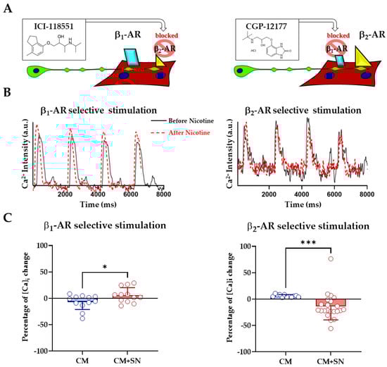 Building on our previous work on β-adrenergic receptor (β-AR)-driven cAMP signaling in SN-CM co-cultures [], we next investigated how β1- and β2- AR subtypes individually modulate CM Ca2+ dynamics in response to sympathetic activation. Both receptors are expressed in CM but exert distinct effects: β1-AR typically enhances contractility via the PKA-mediated phosphorylation of Ca2+-handling proteins, while β2-AR signaling can be more variable—sometimes even inhibitory—due to dual Gs/Gi-coupling and compartmentalized downstream pathways [,]. Our system exhibited elevated expression of both α- and β-AR transcripts (Supplementary Figure S3), consistent with a shift toward a more mature adrenergic phenotype. To dissect their respective contributions, we performed Ca2+ imaging in electrically paced SN–CM co-cultures following the selective pharmacological inhibition of each receptor subtype (Figure 7A). Sympathetic activation was induced by bath application of nicotine (1 µM), and CM Ca2+ transients were recorded in the presence of either ICI-118551 (50 nM, β2-AR antagonist) or CGP-20712 (300 nM, β1-AR antagonist). Selective β1-AR activation (i.e., β2-AR blockade) led to a modest but significant increase in Ca2+ transient amplitude in co-cultures compared to CM alone (Ca2+ change: CM only, –7 ± 4% vs. CM + SN, +6 ± 4%; p < 0.05). Conversely, β2-AR stimulation (β1-AR blocked) resulted in a decrease in Ca2+ transient amplitude (CM + SN, –14 ± 5%; p < 0.05; Figure 7B,C), in line with previously reported inhibitory β2-AR effects under high-stimulation conditions. Interestingly, the Ca2+ response observed during selective β1-AR stimulation (+6 ± 4%) was substantially lower than the full response observed without receptor blockade (+36 ± 5%; Figure 6D and Figure 7B,C), suggesting cooperative or synergistic interactions between β1- and β2-AR in mediating maximal sympathetic responsiveness. These findings demonstrate that our model can resolve receptor-specific signaling dynamics, offering a powerful platform to dissect the nuanced regulation of neuro-cardiac communication during CM maturation.