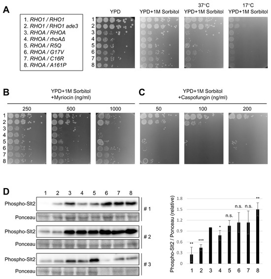 Caspofungin, an inhibitor of 1,3-β-glucan synthase (a known Rho1 target) [33], was used to assess the Rho1-like activity of the RHOA variants. No clear differences in caspofungin sensitivity were observed among the RHOA mutants (Figure 2C), although slight variations were detected at low concentrations (5–50 ng/mL) (Supplementary Figure S1). In contrast, the RHO1/RHO1 ade3 strain showed increased sensitivity at higher caspofungin concentrations, likely due to reduced Rho1 protein expression (Supplementary Figure S2).
