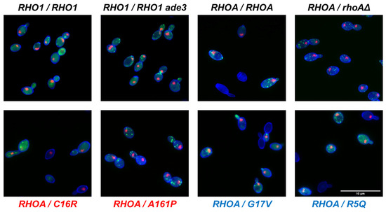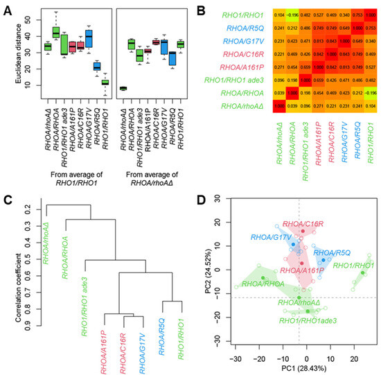 To investigate the morphological consequences of RHOA mutations, we conducted quantitative morphological analyses using phenotypic assay strains. Fluorescence images of the cell wall, actin cytoskeleton, and nucleus were acquired from five biological replicates for four heterozygous RHOA mutant strains (RHOA/C16R, RHOA/A161P, RHOA/G17V, and RHOA/R5Q) and four control strains (RHO1/RHO1, RHO1/RHO1 ade3, RHOA/RHOA, and RHOA/rhoAΔ) (Figure 3). Morphological data sets comprising 501 parameters were extracted from images of a minimum of 200 cells per replicate using the yeast-specific image analysis software CalMorph [28,29].