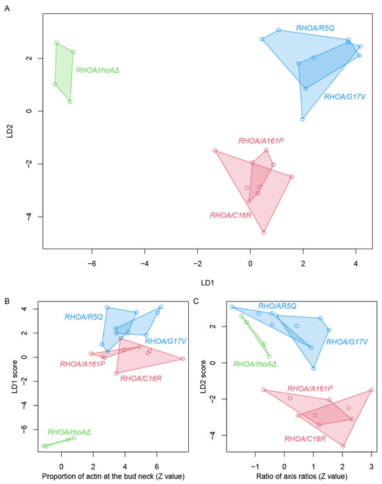 Next, we performed linear discriminant analysis (LDA) [37] on 500 parameters (from 501 features; one excluded due to missing values), after reducing the dataset to 17 PCs explaining more than 90% of the variance (Supplementary Figure S7). This analysis clearly separated the five strains (four RHOA heterozygotes and RHOA/rhoAΔ) into three distinct classes (Figure 5A). The first discriminant axis (LD1) differentiated RHOA heterozygotes from RHOA/rhoAΔ, while the second axis (LD2) distinguished gain-of-function from loss-of-function mutants. The largest loadings were as follows: for LD1, the proportion of actin at the bud neck (A9_A1B) and cell length (C103_A1B); for LD2, the variability in actin patch brightness (ACV122_C) (Figure 5B,C).