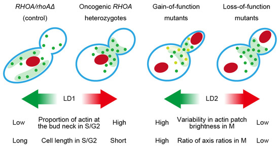 Class-level schematic of morphological signatures and discriminant axes. Cartoons summarize control (RHOA/rhoAΔ) and oncogenic RHOA heterozygotes (gain-of-function and loss-of-function mutants) across cell cycle phases (S/G2, M). Representative features contributing to LD axes (LD1 and LD2) are listed with CalMorph IDs—e.g., proportion of actin at the bud neck in S/G2 phase (A9_A1B), cell length in S/G2 phase (C103_A1B, long-axis length in mother), variability of actin at the bud neck in M phase (ACV122_C), ratio of axis ratios in M phase (C116_C). Colors: green dots, actin patches; light green, actin-rich region; red, nucleus; red and green arrows, increase and decrease in LD scores in Figure 5. See Table S3 for full feature definitions.