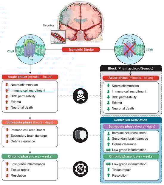The Complement C3a Receptor (C3aR) plays a multifaceted role along the varying temporal phases of brain injury following cerebral ischemia. C3aR is a G-protein-coupled receptor (GPCR) that binds to its ligand, C3a an anaphylatoxin generated during activation of the complement cascade. During ischemia, complement is activated as part of the initial inflammatory response, with C3aRs playing a time-dependent role in both brain injury and repair mechanisms. In the acute phase (minutes to hours post-ischemia), C3aR activation promotes the recruitment of immune cells and the release of chemokines and cytokines, driving blood–brain barrier (BBB) permeability and brain edema. During the subacute phase (hours to days post-ischemia), C3aR continues to modulate immune cell activity, worsening secondary brain injury, although emerging evidence suggests that C3aR activation in this phase may also aid in the clearance of cellular debris and cell survival. In the chronic phase (days to weeks post-ischemia), chronically elevated C3aR activity can prolong neuroinflammation and impair recovery, whereas controlled C3aR signaling in the subacute/chronic phase can activate reparative pathways (e.g., microglial phagocytosis, astrocyte trophic support). As a result, targeting the C3aR requires careful timing to optimize its benefits. Given the dual impact of C3aR activation, which serves to exacerbate injury in the acute phase but supports repair beginning in the subacute and chronic phases, a targeted therapeutic approach should focus on context- and time-dependent modulation of the C3a/C3aR axis. This strategy would involve blocking the C3aR during the acute phase to reduce inflammation and BBB breakdown while controlling C3a signaling in later phases to promote tissue repair.