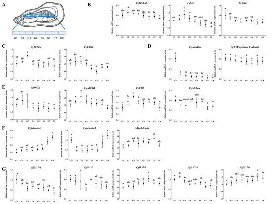 The transcription pattern of hematopoiesis- and immune-related molecules in different sectors of the gill. (A) Schematic representation of eight sectors of the gill. The sectors were named G1 to G8 from the proximal region of the hinge to the distal region. (B–G) The mRNA expression level of hematopoietic transcription factors and immune-related molecules in different regions of gills quantified via RT-qPCR, normalized to CgEF. Vertical bars are shown as the mean ± S.D. (N = 3). The different letters show the significant differences compared with other groups (p < 0.05) as determined by one-way ANOVA with Dunnett’s post hoc test.