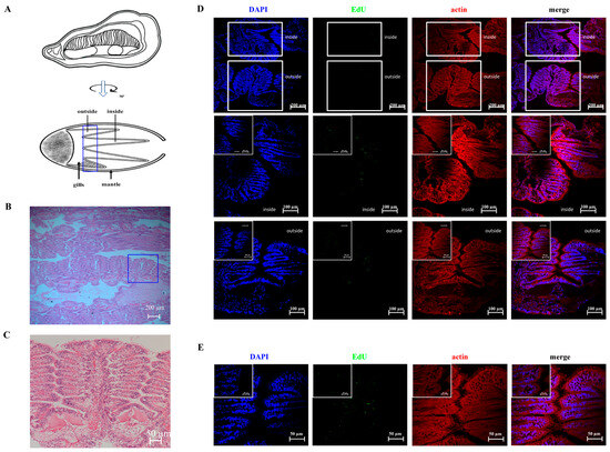 Four inner and outer demi-branches were named according to their locations (Figure 2A). The demi-branches in G2–G3 sector were further stained with HE, EdU, and DAPI. The demi-branch was found to be composed of simple filaments in clusters (Figure 2B), and there was one principal gill filament characterized by chitin-based scaffolds and several normal gill filaments in each cluster (Figure 2C). After HE staining, the nucleus and cytoplasm were observed in blue and pink, respectively. The newborn cells indicated by EdU were observed in green and the nuclei were stained by DAPI in blue. The positive green signals were partially distributed in the inner demi-branch (Figure 2D) and extensively distributed in the edges of gill filaments in normal oysters (Figure 2E).
