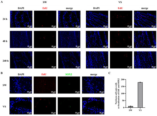 The EdU+ signals and colocalized CgSOX2 in the G2–G3 sector after V. splendidus stimulation. (A) The EdU+ cells detected by immunofluorescence assay in the G2–G3 sector at 24, 48, and 240 h after V. splendidus stimulation. The EdU-stained cells are dyed by the red signals and the blue signals of DAPI indicates nuclei. (B) Immunofluorescence colocalized SOX2 and EdU+ cells in G2–G3 sector at 240 h after V. splendidus stimulation. The SOX2-positive signals labeled with Alexa Fluor 488 are shown in green, and the EdU-positive signals labeled with Alexa Fluor 647 are shown in red. The cell nuclei are stained by DAPI (blue fluorescence). Bar: 20 µm. (C) Newborn cells ratio with CgSOX2 and EdU co-location analyzed by the Pearson correlation coefficient (×100). SW: Seawater; VS: V. splendidus.