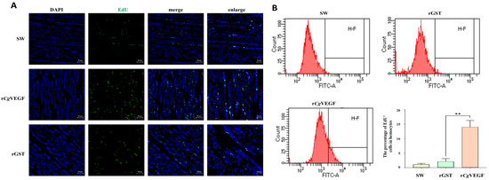 The newborn cells in the circulating hemolymph were examined by flow cytometry. The EdU-positive signals were observed, and the percentage of EdU+ cells in the total circulating hemocytes increased significantly at 6 h after rCgVEGF stimulation (13.0%), which was 6.46-fold of that in the control rGST group (2.01%, p < 0.01) (Figure 4B).