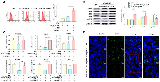 To recognize the possible function of CgVEGFR in rCgVEGF-induced cell proliferation, the newborn hemocytes were examined by flow cytometry after the expression of CgVEGFR was interfered with in vivo with specific siRNA. The expression level of CgVEGFR was significantly down-regulated after the injection with si-CgVEGFR, which was 0.35-fold of that in the control group (p < 0.05). After rCgVEGF stimulation, the expression level of CgVEGFR was significantly down-regulated in si-CgVEGFR + rCgVEGF group, which was 0.27-fold of that in the control si-NC + rCgVEGF group (p < 0.01). The percentage of EdU+ cells in circulating hemocytes increased significantly in the si-CgVEGFR + rCgVEGF group, which was 0.53-fold of that in the control si-NC + rCgVEGF group (p < 0.01) (Figure 5A).