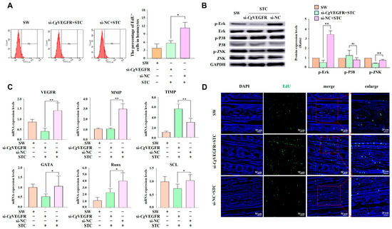 The percentage of EdU+ cells in circulating hemocytes; the phosphorylation levels of the MAPK pathway; the transcription level of CgGATA, CgRunx, CgSCL, CgMMP, and CgTIMP; and the presence of EdU-positive signals in the G2–G3 sector of the gill were examined in si-CgVEGFR oysters after STC (VEGF activator) stimulation. The percentage of EdU-positive cells in circulating hemocytes increased significantly in the si-CgVEGFR + STC group, which was 0.50-fold of that in the si-NC + STC control group (p < 0.05) (Figure 6A). After STC stimulation, the mRNA expression level of CgVEGFR in the G2–G3 sector of the gill was significantly reduced (0.29-fold, p < 0.01) in the si-CgVEGFR group compared with that in the si-NC group (Figure 6C). Additionally, the phosphorylation levels of p-CgErK and p-CgJNK in the si-CgVEGFR + STC group decreased significantly (0.16-fold and 0.62-fold, p < 0.01, respectively) compared with those in the si-NC + STC group. There was no significant difference observed in the expression level of p-CgP38 (Figure 6B).