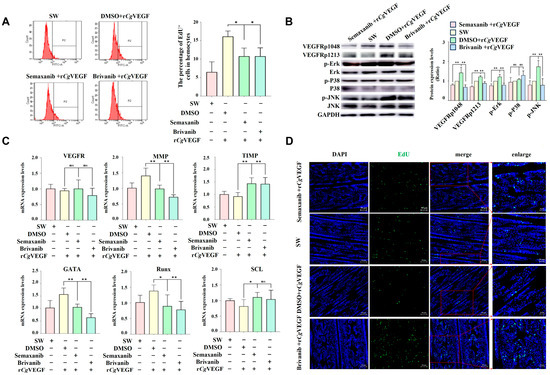 The proliferation and migration capability of cells in the hematopoietic site were examined in VEGFR-inhibited oysters after the treatment with rCgVEGF and the VEGFR inhibitors Semaxanib and Brivanib. The percentage of EdU-positive cells in circulating hemocytes in the Semaxanib + rCgVEGF group and the Brivanib + rCgVEGF group were 0.67-fold (p < 0.05) and 0.67-fold (p < 0.05) of that in the DMSO + rCgVEGF group (Figure 7A). The phosphorylation level of CgVEGFR protein at Tyr1048 and Tyr1213 sites in the Semaxanib + rCgVEGF group and the Brivanib + rCgVEGF group decreased significantly, which was 0.47-fold (p < 0.05 and 0.50-fold (p < 0.05), 0.48-fold (p < 0.05) and 0.73-fold (p < 0.05) of that in the DMSO + rCgVEGF group, respectively (Figure 7C). The levels of p-CgErK and p-CgJNK in Semaxanib + rCgVEGF group and Brivanib + rCgVEGF group decreased significantly, to 0.01-fold (p < 0.01) and 0.01-fold (p < 0.01), 0.01-fold (p < 0.01) and 0.02-fold (p < 0.01) of those in the DMSO + rCgVEGF group, respectively. No significant change in the p-CgP38 level was observed in the Semaxanib + rCgVEGF group or the Brivanib + rCgVEGF group. The mRNA expression level of CgVEGFR in the G2–G3 sector in the Semaxanib + rCgVEGF group and the Brivanib + rCgVEGF group was 1.00-fold (p > 0.05) and 0.99-fold (p > 0.05) of that in the DMSO + rCgVEGF group (Figure 7B). Moreover, the mRNA expression of hematopoietic transcription factors (CgGATA and CgRunx) decreased after Semaxanib and Brivanib treatments, and was found to be 0.67-fold (p < 0.01) and 0.65-fold (p < 0.05), 0.41-fold (p < 0.01) and 0.67-fold (p < 0.01) compared with that in DMSO + rCgVEGF, respectively. The mRNA expression of CgSCL was 1.35-fold (p < 0.05) and 1.20-fold (p > 0.05 of that in the DMSO + rCgVEGF group. The expression level of cell migration-associated molecules (CgMMP) in the Semaxanib + rCgVEGF group (0.70-fold, p < 0.01) and Brivanib + rCgVEGF group (0.52-fold, p < 0.01) decreased significantly, while the mRNA expression of cell migration-associated molecules (CgTIMP) increased significantly (1.56- and 1.54-fold, p < 0.01) in the DMSO + rCgVEGF group (Figure 7C).