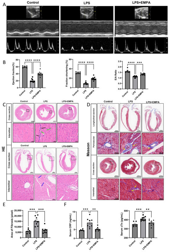 The cardioprotective potential of Empa in endotoxemia was investigated by assessing cardiac performance using echocardiography. As illustrated in Figure 1A, lipopolysaccharide (LPS) administration induced severe cardiac dysfunction. Quantitative analysis confirmed this, revealing a catastrophic decline in systolic function, with ejection fraction (EF) plummeting from a control mean of 59.69% ± 2.71% to 20.38% ± 2.35% (p < 0.0001) and fractional shortening (FS) decreasing from 31.41% ± 1.46% to 8.18% ± 1.22% (p < 0.0001). Diastolic function was similarly impaired, as evidenced by a significant reduction in the E/A ratio from 1.62 ± 0.05 to 1.10 ± 0.06 (p < 0.001). Pre-treatment with Empa markedly reversed these deficits, restoring EF to 40.08% ± 2.81% and FS to 19.05% ± 1.50% (both p < 0.0001 vs. LPS), and significantly improving the E/A ratio to 1.33 ± 0.05 (p < 0.001 vs. LPS) (Figure 1B). Detailed echocardiographic parameters are presented in Table S1. This functional recovery was directly correlated with a reduction in myocardial tissue damage. Histological examination by H&E staining showed that LPS induced significant inflammatory cell infiltration, effects that were visibly attenuated by Empa (Figure 1C). Furthermore, Masson’s trichrome staining revealed extensive interstitial fibrosis in the LPS group, which was quantified as a nearly threefold increase in fibrotic area compared to controls (p < 0.01); Empa pre-treatment significantly reduced this fibrotic response (p < 0.05 vs. LPS) (Figure 1D,E). These structural findings were substantiated by serological markers of cardiac injury and inflammation. ELISA results demonstrated that the LPS-induced surge in serum cardiac troponin T (cTnT) was significantly blunted by Empa (p < 0.01), as was the elevation in C-reactive protein (CRP) (p < 0.05) (Figure 1F). Collectively, these data provide convergent evidence from functional, structural, and molecular assays that Empa ameliorates LPS-induced cardiac dysfunction by preserving myocardial integrity and attenuating the inflammatory and fibrotic response.