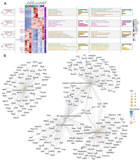 Bioinformatic validation on an independent dataset pinpoints the “Cytoskeleton in muscle cells” pathway as a central pathogenic hub. (A) Re-analysis of a publicly available transcriptomic dataset (GSE267388) from LPS-challenged hearts using a multi-panel format showing cluster expression trends, gene expression heatmap, and GO and KEGG pathway enrichment. (B) Gene-concept network visualizing the hierarchical organization of dysregulated pathways, highlighting the cytoskeletal/ECM-receptor module as distinct from the inflammatory cascade.