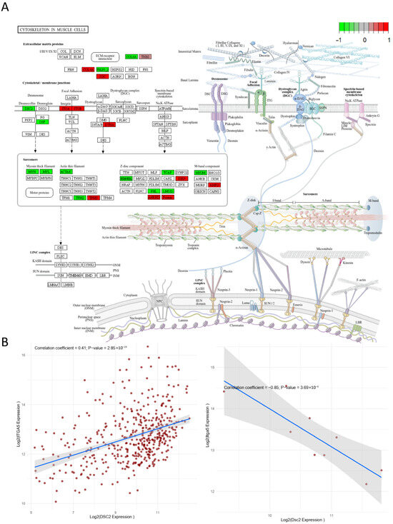 LPS induces a pathological inversion of the physiological ITGA5-DSC2 adhesion axis. (A) Pathview visualization of the KEGG “Cytoskeleton in muscle cells” pathway, illustrating LPS-induced dysregulation of genes encoding structural proteins. (B) Correlation analysis of ITGA5 and DSC2 expression. Left: A significant positive correlation is observed in normal human heart tissue from the GTEx database (r = 0.41, p < 2.85 × 10−19). Right: A strong negative correlation is induced by LPS challenge in the experimental mouse model (r = −0.85, p < 3.69 × 10−3), demonstrating a pathological inversion of the relationship.