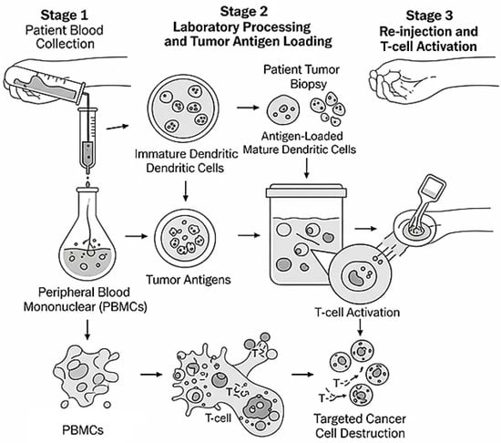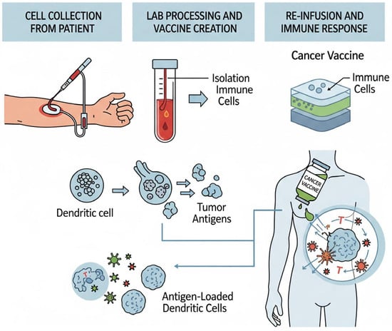 The primary feature of dendritic cell (DC) vaccines’ favorable safety profile is their low-grade adverse events. Local injection site reactions and transient constitutional symptoms like fatigue and myalgia are the most common toxicities; dose-limiting toxicities have not been observed in more recent trials [17,18]. While monotherapy has achieved little tumor shrinkage, combination regimens—such as DC vaccines with chemotherapy, immune checkpoint inhibitors (anti-PD-1/PD-L1), or cytokine-induced killer cells—have shown greater immune activation and improved survival outcomes [19]. To enhance antigen presentation and combat tumor-induced immunosuppression, new strategies are being researched, such as exosome-pulsed DCs and mRNA-electroporated DCs [20]. Despite the lack of extensive phase III trials, DC vaccines may be most useful as maintenance therapy following chemoradiation or in cases with minimal residual disease. Ongoing research focuses on optimizing synergistic combinations, delivery strategies, and antigen selection to maximize therapeutic benefit [19,20].