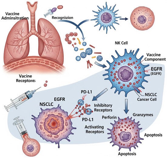 Natural killer (NK)-cell-based vaccines and treatments are examples of new immunotherapeutic approaches for NSCLC. By using death receptor signaling, perforin/granzyme release, and antibody-dependent cellular cytotoxicity (ADCC), NK cells, innate lymphocytes, can eliminate tumor cells without first sensitizing the cells [46]. In NSCLC, inhibitory checkpoints are upregulated and activating ligands are downregulated, necessitating the therapeutic enhancement of NK activity [47] (Figure 3).
