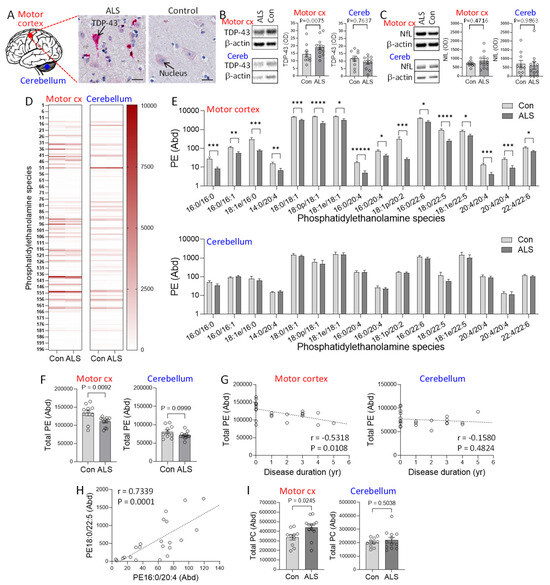 Assessment of phosphatidylethanolamine in amyotrophic lateral sclerosis (ALS) brain. (A) TDP-43 deposits (red staining) localized in the neurons of ALS motor cortex, counterstained with hematoxylin to show the cell nucleus blue. Bar = 20 µm. (B) TDP-43 expression in the disease-affected motor cortex and disease-unaffected cerebellum of ALS (N = 12) and controls (N = 10) as measured by western blotting and normalized with β-actin. (C) NfL in the motor cortex and cerebellum as measured by western blotting and normalized with β-actin. (D) Heat map of 196 phosphatidylethanolmine (PE) species in the two brain regions. (E) PE species (Abundance) that are altered in ALS compared to controls. The abundance was obtained from LC-MS peak areas relative to internal standards and normalized to the weight of the brain tissues used. p < 0.05 *, 0.01 **, 0.005 ***, 0.001 ****, 0.0005 *****. (F) Total PE (Abundance) in ALS compared to controls in motor cortex and cerebellum. (G) Correlation between total PE and disease duration in the two brain regions. (H) An example of the association among the PE species that are decreased in the motor cortex. (I) Total phosphatidylcholine (PC) (Abundance) in ALS compared to controls. Data represent mean and S.E.M. as error bars.