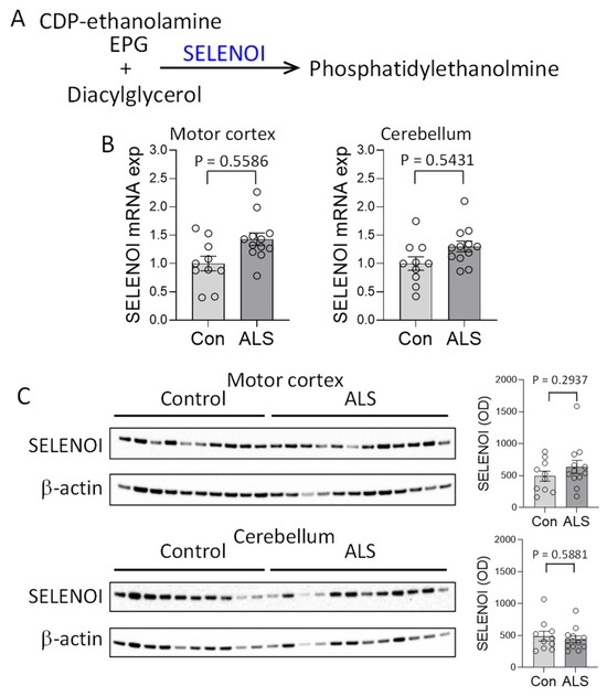 To understand the possible cause of the PE decrease in ALS motor cortex, we assessed the expression of SELENOI, the gene responsible for PE synthesis (Figure 2A). Using the same tissue samples as the lipid analysis, SELENOI expression was analyzed, covaring for age and sex. SELENOI mRNA expression was unaltered in the motor cortex of ALS compared to controls (Figure 2B). SELENOI protein expression was also unaltered (Figure 2C). These results were surprising because a decrease in PE would have caused an upregulation of SELENOI expression as a feedback response [7]. In the cerebellum, where PE level was unaltered, neither SELENOI mRNA nor protein expression was altered in ALS (Figure 2B,C).