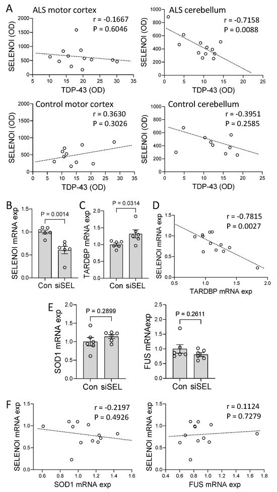 It is unknown whether SELENOI is pathologically linked to TDP-43, the most important pathogenic protein in ALS brain. We therefore carried out a correlation analysis between SELENOI and TDP-43 in ALS brain using the two-tailed Pearson correlation at a confidence interval of 95%. There was a strong inverse correlation between SELENOI and TDP-43 in the cerebellum (Figure 3A). In contrast, this correlation was absent in the motor cortex (Figure 3A). The correlation was also absent in the control tissues (Figure 3A). To further investigate the relationship between SELENOI and TDP-43, SH-SY5Y neuronal cells were cultured and treated with SELENOI siRNA or scramble siRNA (control), and SELENOI and TARDBP expression were assessed by qPCR. Firstly, the knockdown of SELENOI expression in the SELENOI siRNA-treated cells was verified (Figure 3B). Importantly, the knockdown of SELENOI expression caused a significant upregulation of TARDBP expression (Figure 3C). Furthermore, SELENOI expression was inversely associated with TARDBP expression (Figure 3D), as was the case in ALS cerebellum (Figure 3A). In addition, we were interested in whether SELENOI affected other key genes associated with ALS, i.e., SOD1 and FUS. We found that the expression of SOD1 and FUS were unaffected by the SELENOI knockdown (Figure 3E) or associated with it (Figure 3F). When put together, these results suggest that SELENOI-mediated repression of TDP-43 is lost in ALS motor cortex, providing further evidence that SELENOI is dysregulated in ALS brain.