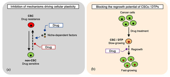 Therapeutic strategies targeting cancer cell plasticity and state transitions. (a) Cancer cells transition between distinct cancer stem cell (CSC) states, contributing to therapy resistance and relapse. Blocking plasticity mechanisms—such as niche-dependent cues and dedifferentiation of non-CSCs—may prevent CSC pool restoration [24,26,29,31,32,35,36,70,71,72]; (b) Targeting the regrowth potential of drug-tolerant persister (DTP) cells and CSCs to inhibit tumor persistence [25,26,27,32].